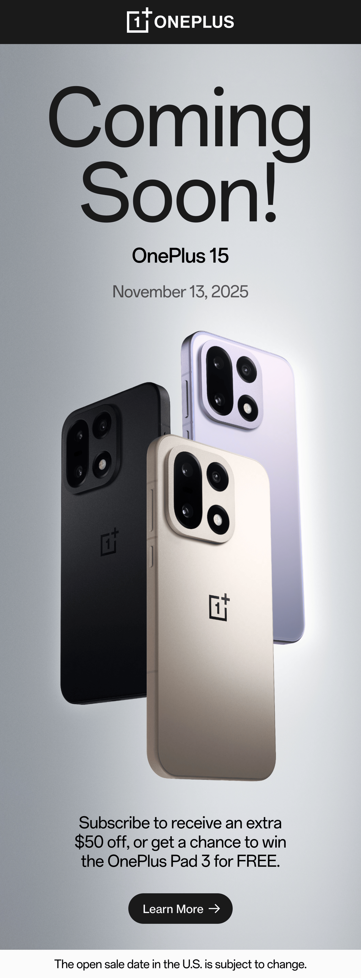 The OnePlus 15 is Coming Soon‼️ published on October 29, 2025 leave a reply Learn More to Get Exclusive Benefits. OnePlus USA Corp, 2479 E Bayshore Rd STE 120, Palo Alto, CA 94303 Unsubscribe Manage preferences Tweet Share Share Share Share Previous Post Next Post post written by: admiad